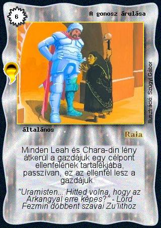 Kiadás: Aranyforrás, Túlélők Földje Gyakoriság: ritka Lapszín (isten): Raia Típus: általános Szöveg: Minden Leah és Chara-din lény átkerül a gazdájuk egy célpont ellenfelének tartalékjába, passzívan, ez az ellenfél lesz a gazdájuk. Szinesítő szöveg: "Uramisten... Hitted volna, hogy az Arkangyal erre képes?" - Lord Fezmin döbbent szavai Zu'lithoz Illusztráció: