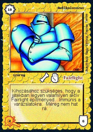 Kiadás: Alappakli, 1. kiadás, Védnök 2021 Gyakoriság: ritka Lapszín (isten): Fairlight Típus: szörny Szöveg: Kihozásához szükséges, hogy a játékban legyen valamilyen aktív Fairlight építményed. Immúnis a varázslatokra. Méreg nem hat rá. Illusztráció: Nagy Viktória, Fischer Tamás