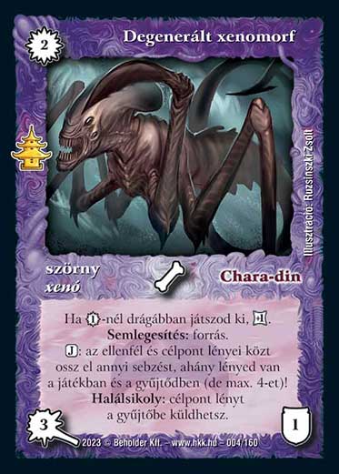 Kiadás: Császárváros Gyakoriság: ritka Lapszín (isten): Chara-din Típus: szörny Altípus: xenó Szöveg: Ha 1_VP-nél drágábban játszod ki, [[1]]. Semlegesítés: forrás. (J): az ellenfél és célpont lényei közt ossz el annyi sebzést, ahány lényed van a játékban és a gyűjtődben (de max. 4-et)! Halálsikoly: célpont lényt a gyűjtőbe küldhetsz. Illusztráció: Ruzsinszki Zsolt