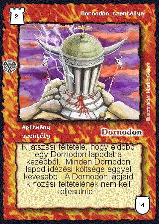 Kiadás: Isteni szövetség Gyakoriság: ritka Lapszín (isten): Dornodon Típus: építmény Altípus: szentély Szöveg: Kijátszási feltétele, hogy eldobd egy Dornodon lapodat a kezedből. Minden Dornodon lapod idézési költsége eggyel kevesebb. A Dornodon lapjaid kihozási feltételének nem kell teljesülnie. Illusztráció: Markó Gábor
