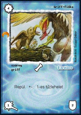 Kiadás: Chara-din visszatér Gyakoriság: gyakori Lapszín (isten): Elenios Típus: szörny Altípus: griff Szöveg: Repül. +-: 1-es tűzlehelet. Illusztráció: