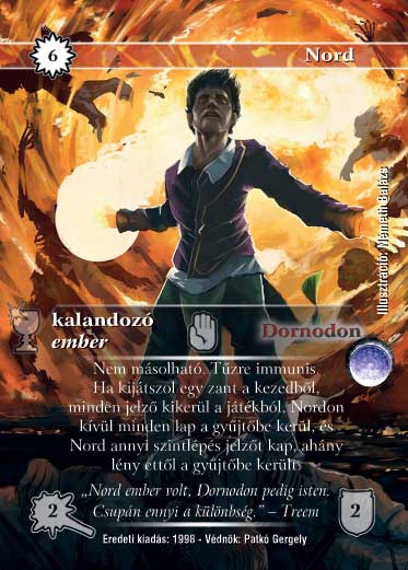 Kiadás: Árnyékhold, Védnök 2023, Túlélők Földje Gyakoriság: ritka Lapszín (isten): Dornodon Típus: kalandozó Altípus: ember Szöveg: Semmilyen módon nem másolható. Tűzre immúnis. Amikor egy zant kijátszol a kezedből, Nordon kívül minden lap és jelző a gyűjtőbe kerül, és Nord annyi szintlépés jelzőt kap, ahány lény ettől a gyűjtőbe került. Szinesítő szöveg: "Nord ember volt, Dornodon pedig isten. Csupán ennyi a különbség." - Treem Illusztráció: Gőgös Károly
