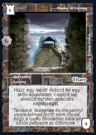 Kiadás: Rhatt fénykora, Alappakli, 8. kiadás Gyakoriság: nem gyakori Lapszín (isten): Tharr Típus: építmény Altípus: torony Szöveg: Húzz egy lapot! Áldozd fel egy aktív épületedet: célpont lap elveszti minden speciális képességét. Szinesítő szöveg: "Teriádok, drákenek és megannyi veszedelmes törzs: nem csoda, hogy a ryuku birodalom határait sűrűn pettyezik az őrtornyok." Illusztráció: Szeiner András